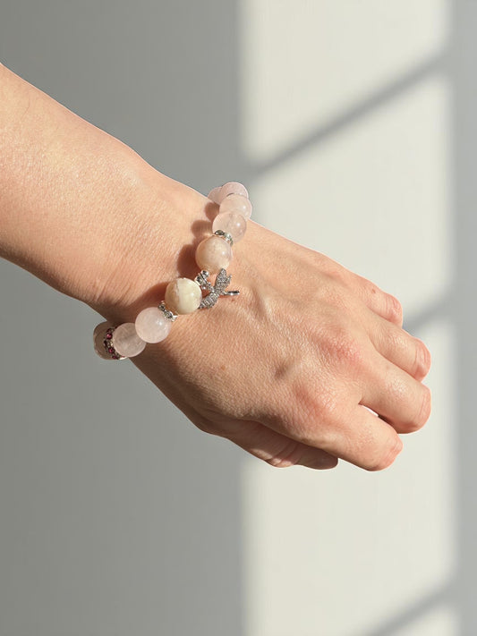 Flower Agate and Rose Quartz Dragonfly Crystal Bracelet