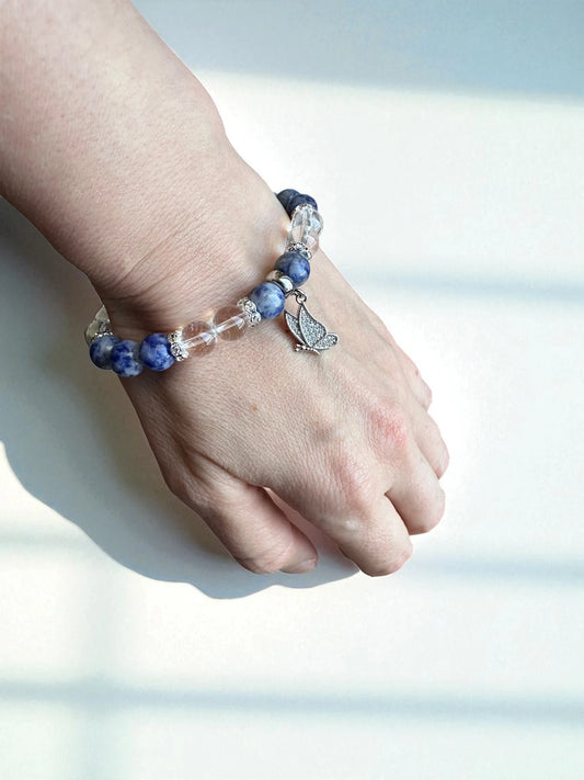 Blue Spot Jasper & Clear Quartz Rhinestone Butterfly Crystal Bracelet