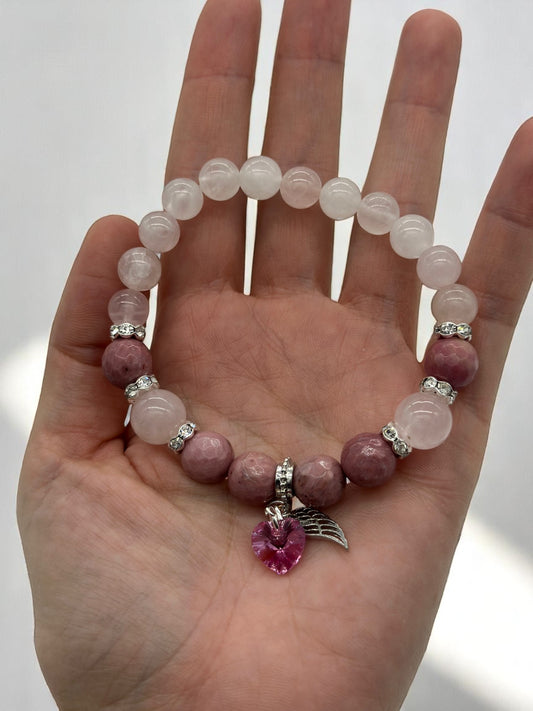 Rhodonite and Rose Quartz Swarovski Heart Crystal Bracelet