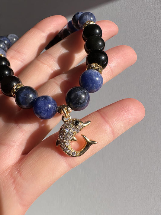 Black Obsidian and Sodalite Rhinestone Dolphin Crystal Bracelet