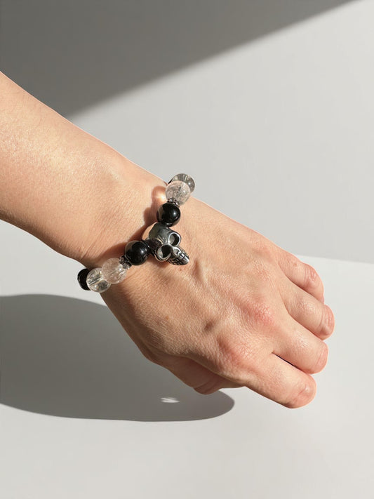 Black Onyx and Clear Quartz Big Skull Crystal Bracelet