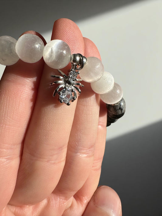 Snowflake Obsidian and Selenite Spider Crystal Bracelet