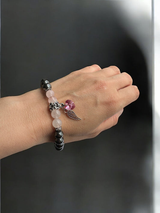 Rose Quartz & Hematite Rhinestone Hearts Crystal Bracelet